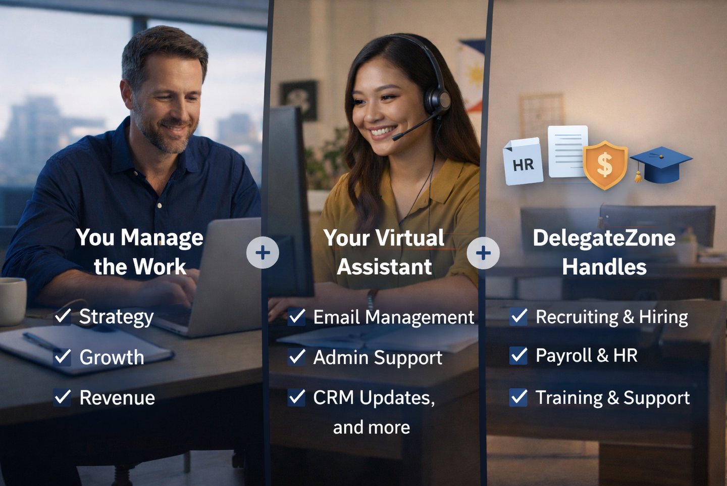 HR, payroll, and ongoing management handled by DelegateZone